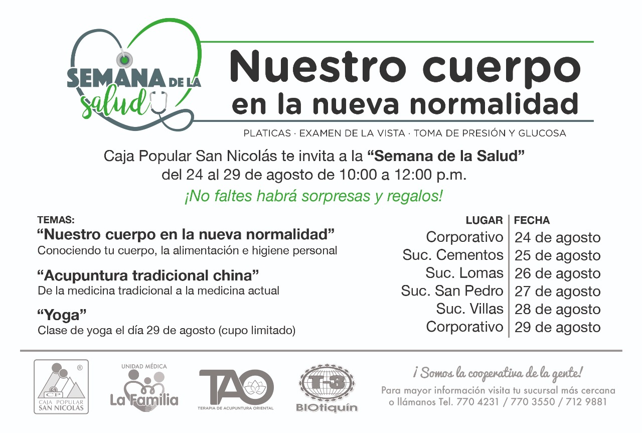 En el marco del 58 aniversario de Caja Popular San Nicolás, de León Guanajuato y considerando  la presente crisis sanitaria por el COVID 19 la cooperativa celebra organizando la semana de la Salud.